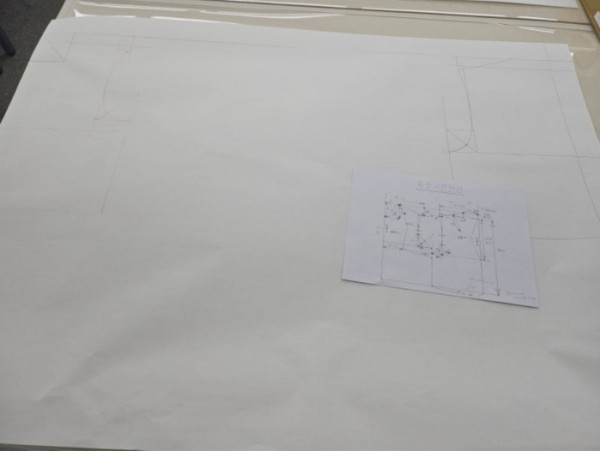 우선 자와 도구들을 준비해 줍니다. 그리고 5cm를 위아래로 띄운 후 뒷판부터 그리기 시작해요. 티판 중심선부터 시작해서 목선, 허리선 ,밑단선, 암홀 등을 그려주고요.