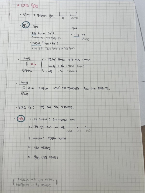스커트 별 실루엣 차이, 다트의 위치와 분산에 대한 이해, a-line과 플레어 밑단 나가는 정도 및 힙선 차이 등을 분석해보았습니다.