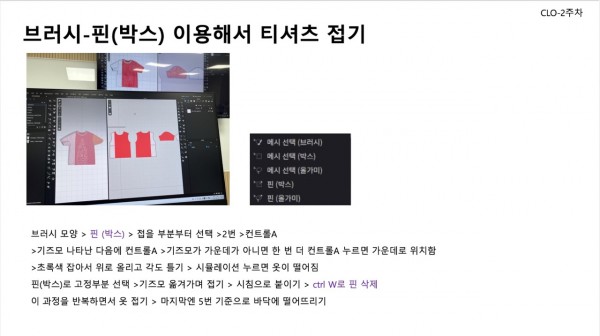 브러시-핀(박스)를 사용하여 접는 방법과 3d 의상 접기 툴을 이용해서 접는 법을 배웠는데, 두 번째 방법이 훨씬 간편하여 더 많이 사용하지만 핀(박스)를 이용하는 법부터 천천히 알려주셔서 옷이 접어지는 과정과 이론을 확실하게 배울 수 있었습니다. 중간에 알려주신 시침관련 팁도 유익했습니다.