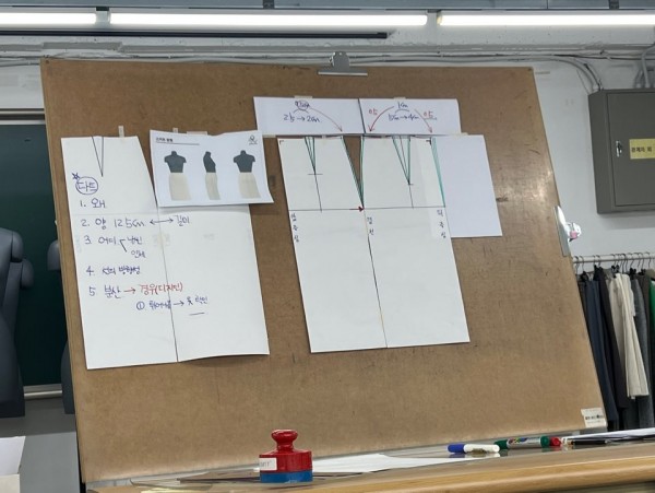 도식화를 보고 패턴을 그릴 때 실루엣을 보는 법부터, 얼마나 늘릴지 기초를 탄탄하게 알려주셨다.