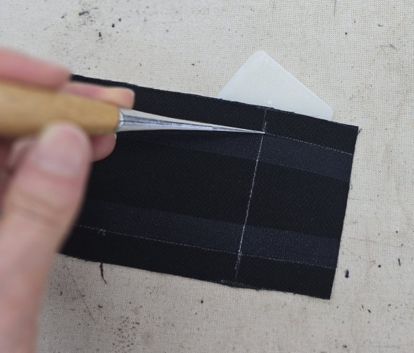 - 오비는 완성선보다 1인치 크게 재단 후 심지를 붙였어요. 심지 부착 후 중심선을 표시하고, 다대테이프를 살짝 내려서 부착하는 과정도 진행했어요.