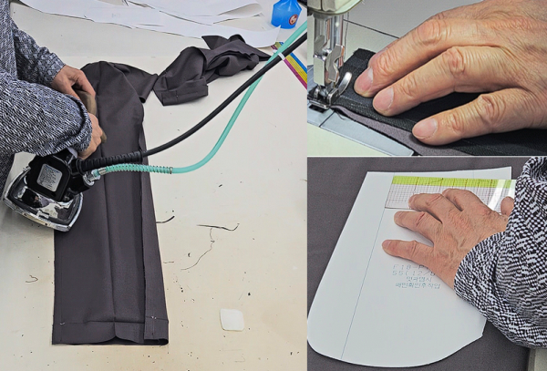 재단되어 있는 바지는 무릎선을 맞추어 핀을 꽃아서 정리해주고 봉제하는데 뒷판이 조금 긴게 맞다고 합니다.