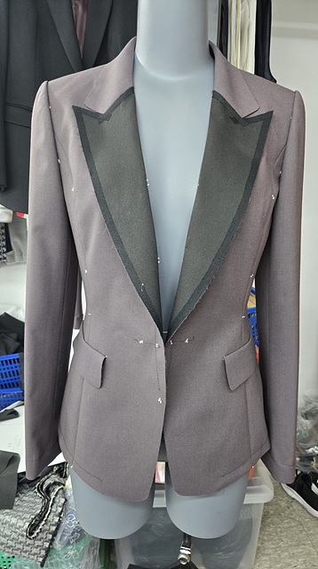 가봉 상태로 바디에 착장해 소매 곡선과 옆솔기, 그리고 전반적인 실루엣을 확인했어요.