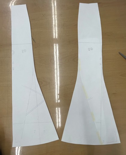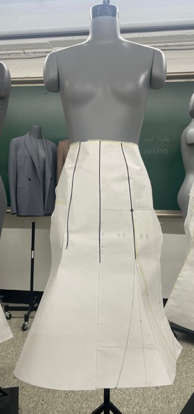오늘은 고어드 스커트에 대한 원리를 스커트 원형에서 변형하여 직접 패턴을 제도하여 보았다. 처음에는 플레어 스커트와 고어드 스커트의 차이점에 대해서 막연하게 절개선과 쪽으로 분리된 것이라고 생각을 했었지만, 강사님께서 고어드 스커트의 개념과 활용을 정확하게 짚어주셔서 차이점을 잘 설명 할 수 있게되었다. 아자스 화이팅!!!