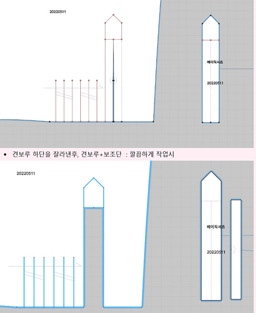 - 앞판과 뒤판의 패턴을 대칭 복사하고, 단작을 정리했습니다.