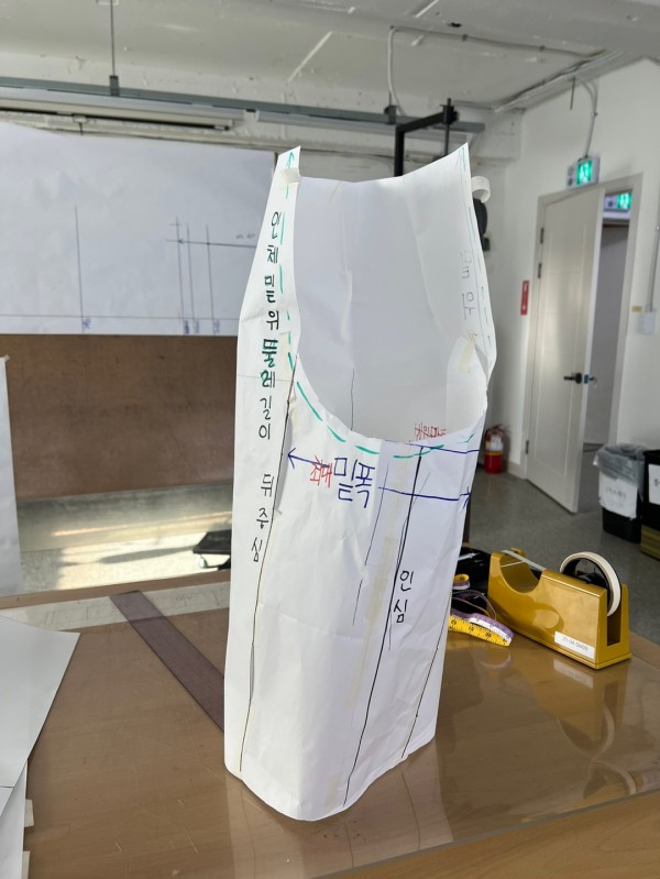H라인 스커트로 출발하여 바지 패턴으로 변화하는 과정을 직접 종이를 가지고 작업해보며, 무엇이 변화하며 무엇이 새로이 생겨나는지 보다 쉽게 이해해 볼 수 있었습니다.