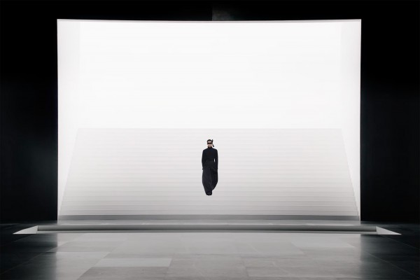 무대에서 검은 배경 가운데 새하얀 사각형의 내부 공간에서 검은 실루엣의