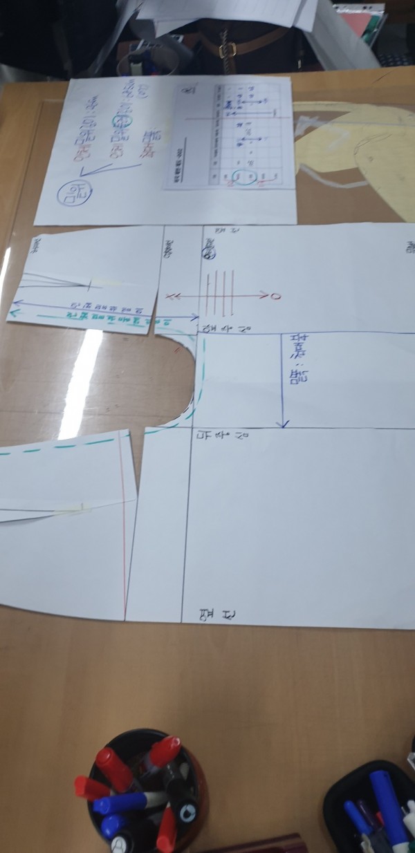 (1cm 안 옮기고 같은 선상에서 뒤판이 시작하면 어떻게 되는지 보기 위해 안 옮긴 뒤패턴도 제도해서 비교해 보왔습니다.