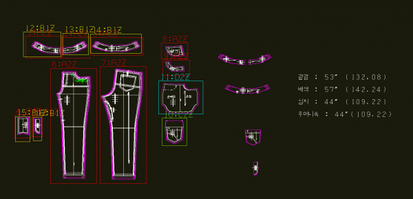 *영역을 잡으면 영역 이름 설정창이 뜨는데 마카정보 > 소재 수정 버튼을 클릭해줘서 옷 한 벌에 들어가는 소재 정보를 기입하고 색상도 다르게 바꿔준다. (ex A.겉감 B.심지)