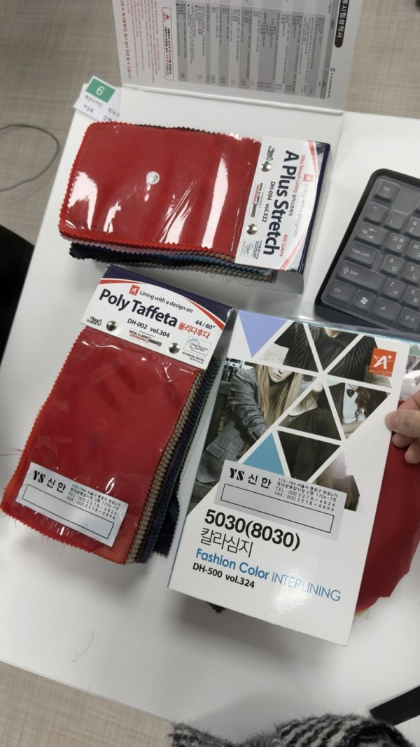 안감과 심지 테이프들을 샘플로 챙겨오셔서 보여주셨습니다.