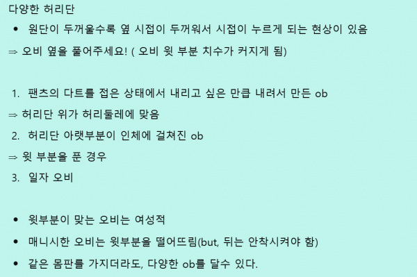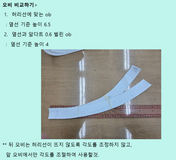 특히 앞 오비 벌리기의 스타일별 조정 폭(0.6cm 등)과 다트를 기준으로 자연스러운 곡선을 만드는 과정이 실습으로도 진행되어 이해가 쉬웠습니다.