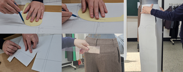 와이드 통바지는 앞판을 먼제 그리고 앞판을 복사하여 뒷판을 제도하면 됩니다. 앞판보다는 뒷판이 더 넓기 때문에 기울기가 중요했고 그릴때 직선인듯 하여도 곡자로 예쁘고 자연스럽게 그리는 것이 핵심이였습니다. 뒷판이 조금 더 복잡하여 멍때리는 순간도 잠시 있었으나 강사님께 질문하여 완성할 수 있었습니다. 여러번 제도해야 이해할 수 있을 듯 하여 나머지는 주말동안 한번 복습하는 것으로 하고 남은 시간은 4명씩 팀을 만들어 가봉해 보는 시간을 갖었습니다.