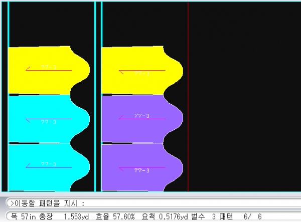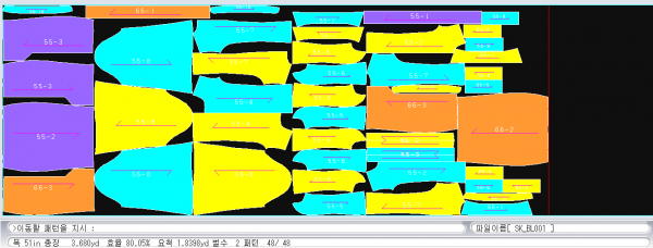 -> 아래가 원단 위에는 테이블 / 원단 (아래 화면에) 넣어주기 슬라이딩 -> (왼쪽 하단에 효율 요척 등 확인)