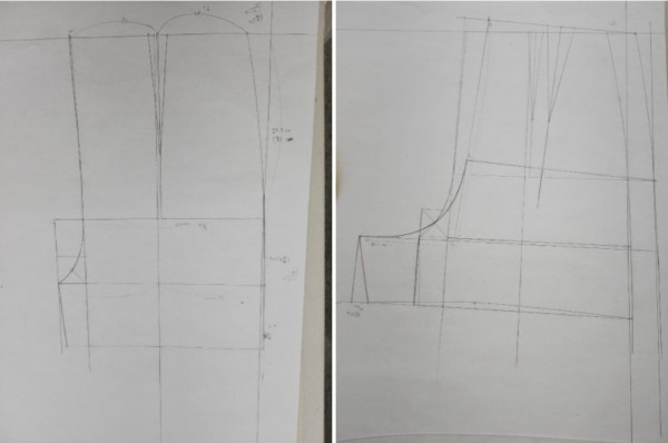 뒷판 패턴의 곡선을 그릴 때에는 신경 써서 곡자에 곡진 부분을 중간으로 가게 해서 그려주어야 해요