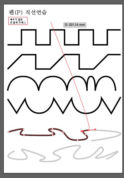 처음엔 인터페이스와 직선연습을 알려주셨어요! 펜툴을 나오게 하는 방법 단축키(P)와 핸들 사용법 (양 옆으로 늘리기 등)