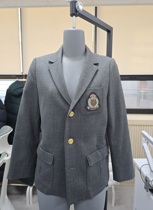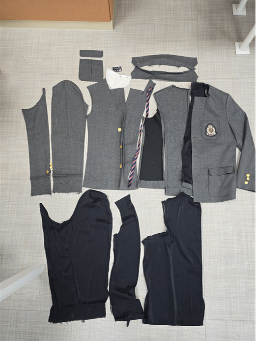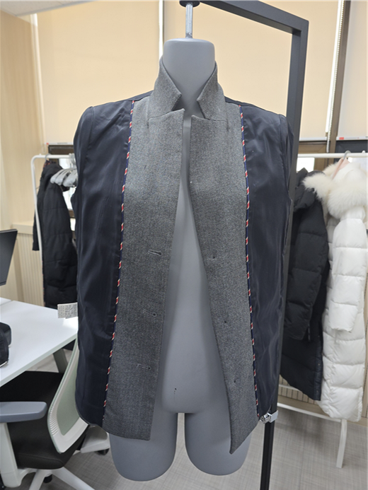 신사복/숙녀복 자켓하고는 다르게 주머니 등이 위에서 그냥 눌러박기 되어 있었고 반면