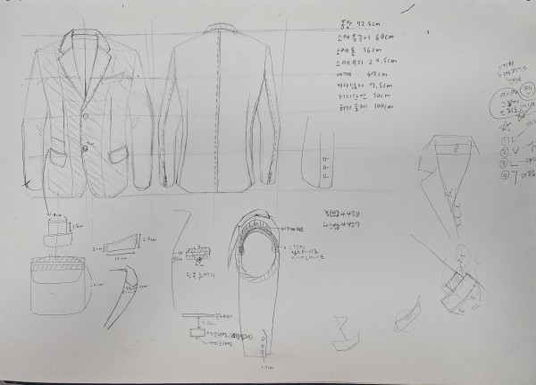 전체적인 비율을 맞춘뒤에 양옆의 대칭을 주의하며 사이즈 재는법을 맨 먼저 가르쳐 주셨어서 작업지시서의 사이즈 스펙을 적어주고, 자켓을 그려주면 오늘의 작업지시서 완성!