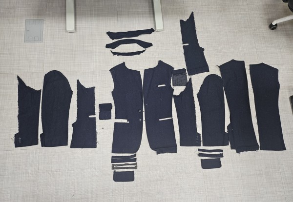 겉감을 해체한 모습입니다. 두장소매로 되어있는 소매와 주머니 플립, 입술감, 카라는 둥근 재단으로 처리한 점이 인상깊었어요.