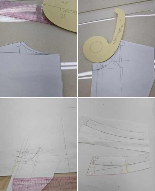 이렇게 재단까지 마친 앞판 뒤판 사이바를 다시 목선 수정해주고요. 안쪽으로 더 파준 뒤에 카라와 카라밴드를 목 둘레에 맞게 그려줍니다