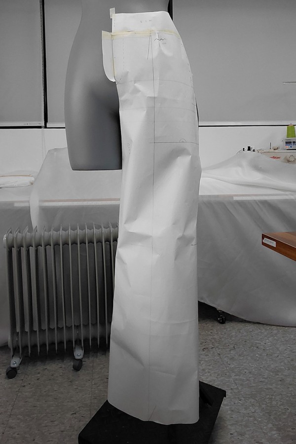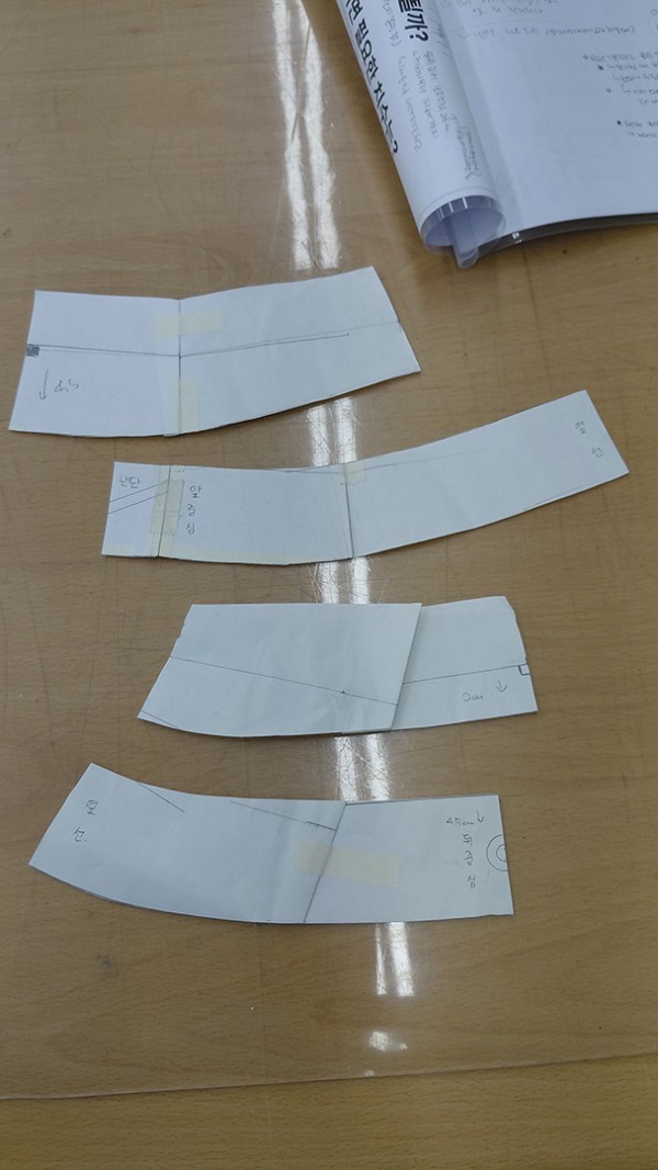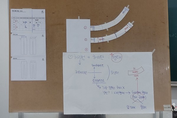 지난 시간에 이어 오비와 포켓, 플라이 같은 부속들을 제도하고 전체적인 팬츠 제도를 완성하여 종이가봉해보았습니다.