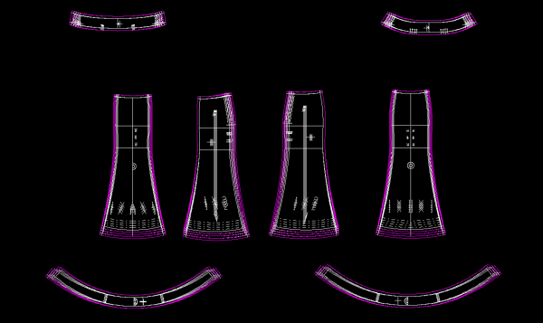 (1) 단축키: pl을 활용하여 고어드 스커트에서의 몸판 패턴들에서의 밑단 선들로부터 4 (cm) 정도 떨어진 곳에 평행 선분들을 표시한다. 이 선분들이 안단 패턴들에서의 윗 쪽 외곽선들이 된다.