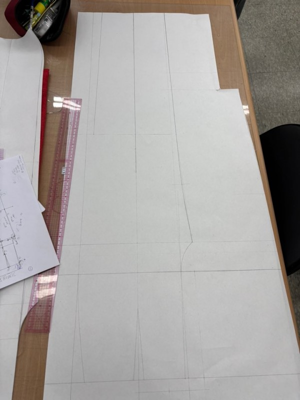 옆선을 깎고, 다트잡고, 앞중심쪽을 깎은 점을 아까 더해준 길이(가로로 앞중심쪽으로 3센치)에 곡선과 직선으로 라인을 만들며 잇는다. 옆선쪽도 마찬가지로 곡자를 사용하여 잇는다.