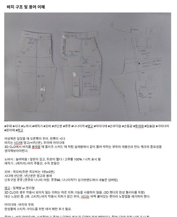 강사님께서 준비해주신 종이 패턴을 통해 바지의 구조와 부속, 봉재, 실무적인 부분들을 쉽게 이해해 볼 수 있었습니다.
