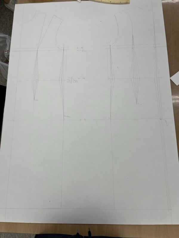 상의 원형을 응용해서 토르소 원형도 배웠습니다. 핏을 비교해보기 위해 짝꿍과 반씩 나눠 그린 후 종이 가봉을 했습니다.