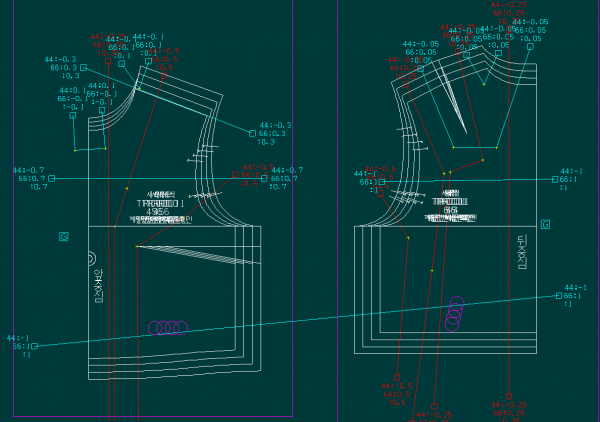 - 여성복 실무 그레이딩에서 진동둘레 기장 편차만 줘서 기장 편차를 안주는 방법 주로함 그리고 옆목점만 파란선으로 잡아줘서 어깨선의 각도를 목과 진동 뚫어주면서 잡는 것 보다 더 각도를 지켜주는 방법을 쓰기도 함!