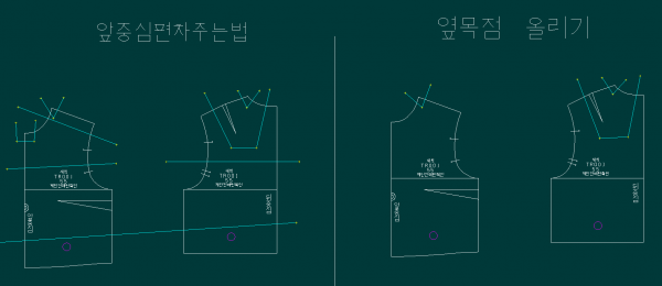- 목진동 통과 파란선보다 옆목점 잡아올리기의 어깨선 각도차이는 확연히 크다 - 이방법 할 때 뒤판도 같은 량 같은 위치에 넣어줘야하는데, 뒤판은 다트가 잇기에(젉개선) 다트의 양쪽선을 같이 잡아서 올려야함! - 옆목점량과 다트포함 절개선량을 분산해서 올려줘야 다트의 각이 그대로 살아서 올라감!