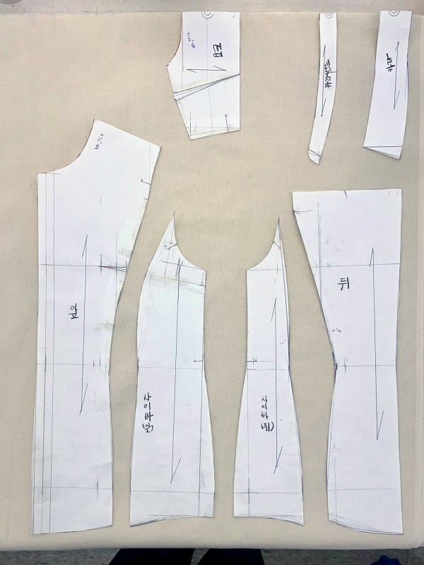 패턴에 시접을 먹인 뒤 그룹스터디를 위해 재단을 하였습니다.