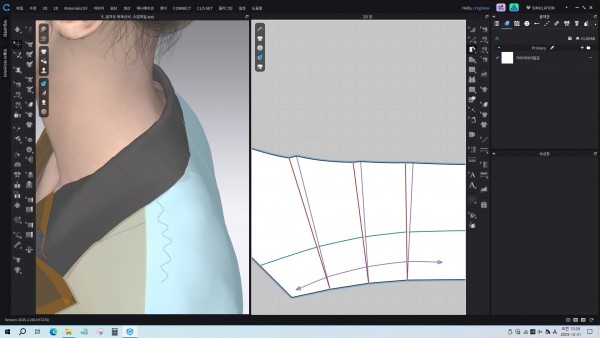 특히 오전 시간대 자켓 칼라를 접고 패턴 벌리기를 통해서 변형이 필요한 칼라를 수정하였는데,