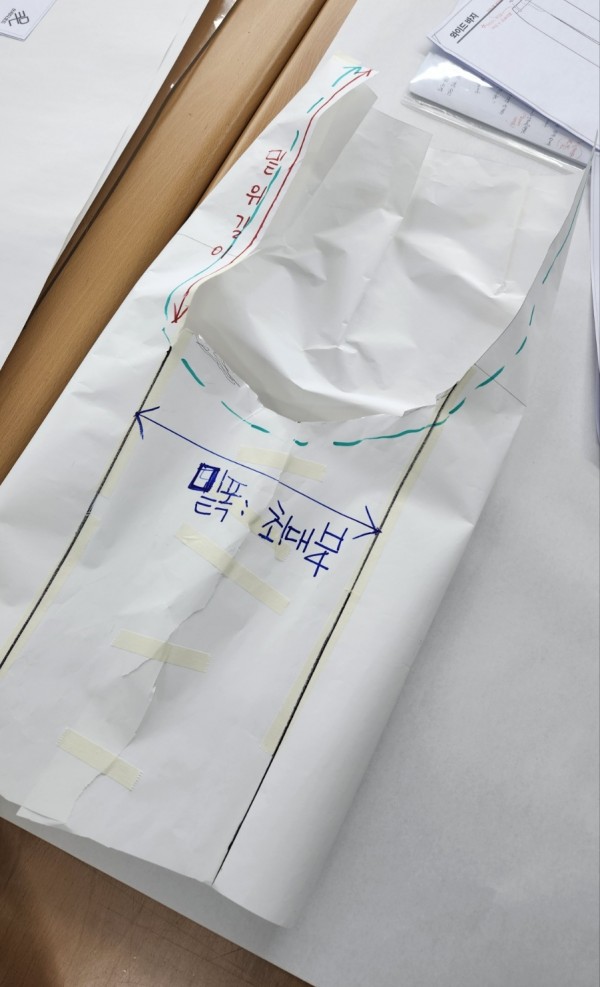 치마 패턴에서 변형이 된다고 생각했는데 알아야할 치수도, 제작 방법도 치마와 완전히 달랐어요. 처음 긋는 선부터 무려 5개^^; 나눠주신 표를 보며 겨우 따라갈 수 있었는데 연습을 많이 시켜주셨지만 표 없이 바지 패턴을 뜬다면 정말 막막할 것 같아요 코팅해서 평생 들고다니고 싶습니다.. 중간에 줄을 잘못그어 큰 위기가 있었지만 팀원과의 협동심으로 수업 진도를 잘 따라갈 수 있었어요