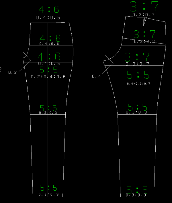 그리고 바지는 스커트와 달리 밑위선이 있기때문에 기장의 편차와 밑위의 편차를 계산해서 각 절개선에 넣어주어야 합니다.
