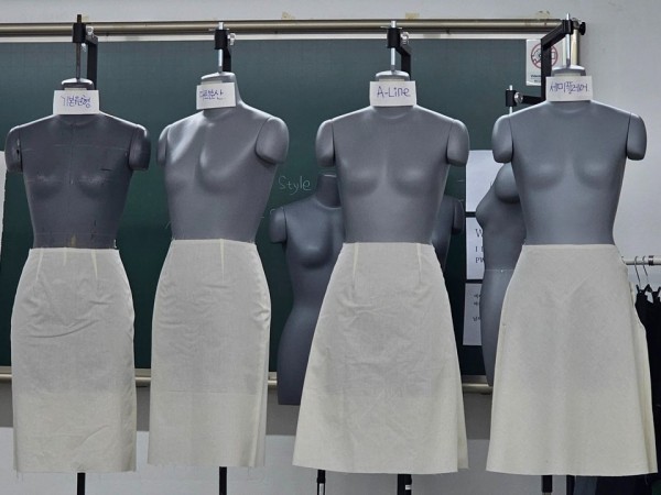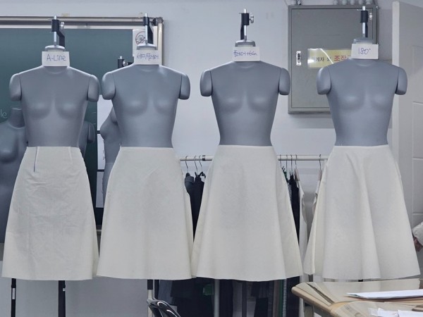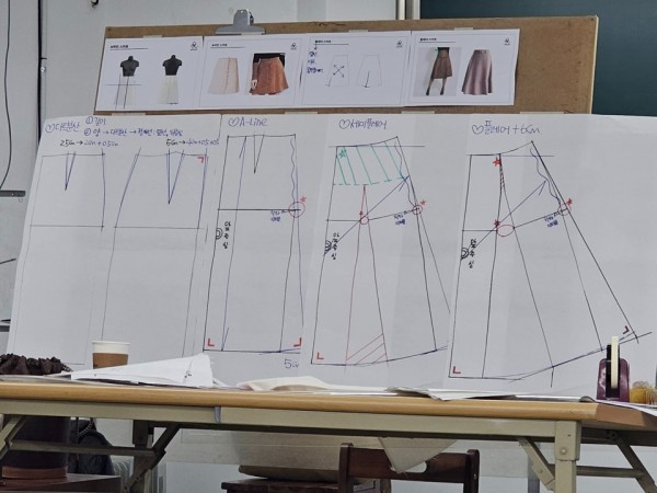 기본 패턴을 바탕으로 고어드스커트(쪽 스커트)를 제도하였고, 조별로 논의하며 응용 버전의 고어드스커트를 제도하였습니다.