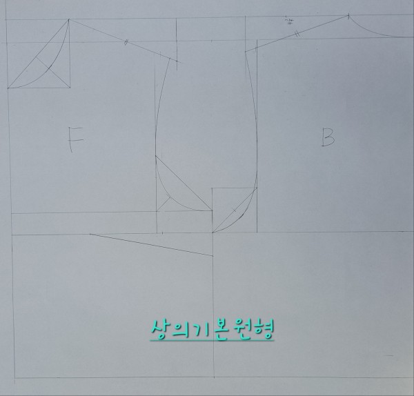 앞뒤 암홀라인 그릴 때 곡자 사용방법, 앞 몸판의 B.P지점 등 강사님이 일러주신 부분들을 생각하면서 기본원형을 완성했습니다.