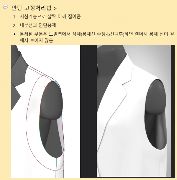 - 칼라와 라펠의 꺾임선 간격을 조정하고, 내부선분을 추가해 보다 정밀한 조정을 했습니다.