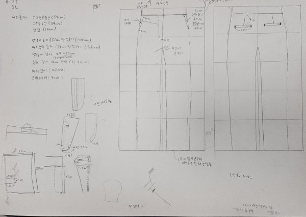 도식화에 자세히 보면 치수, 전채적인 바지의 모습, 주머니와 각종 부자재를 자세히 표현하였어요.