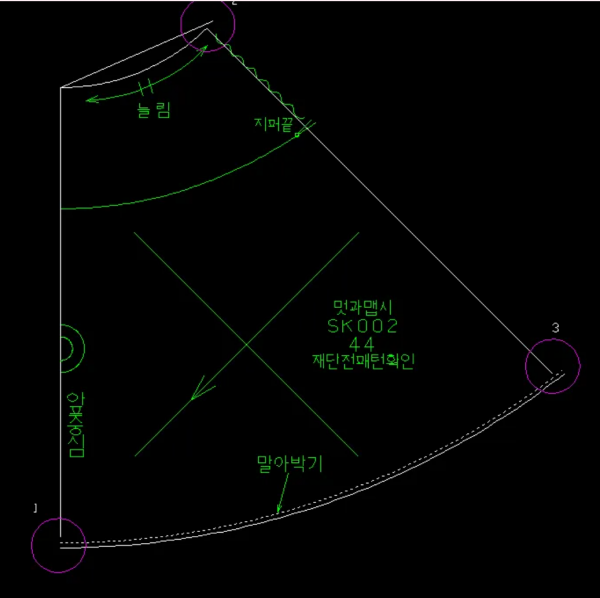 패턴을 열고 중심선을 설정한 후 결선을 맞추는 작업을 진행했는데, 바이어스를 그린 후 초록 선으로 만들어 mvrt로 겹친 후 결선을 조정하는 방식이 인상적이었어요.