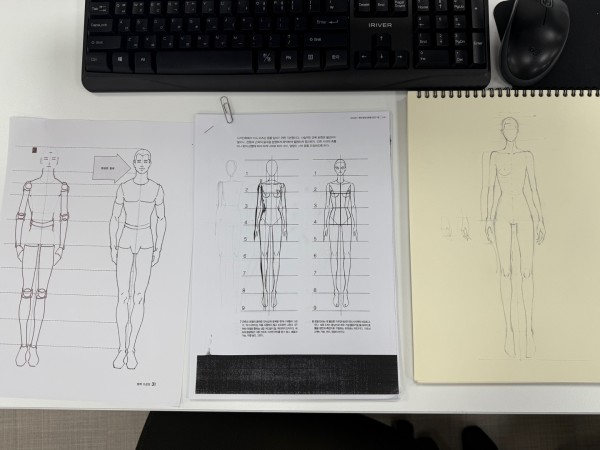 그리는 과정에서 특히 인상 깊었던 점은, 인체는 모두 곡선으로 이루어져 있으므로 팔과 다리 같은 부위를 단순한 직선이 아닌 유연한 곡선 형태로 표현해야 한다는 지적이었습니다. 이 부분은 패션 일러스트뿐 아니라 향후 의복 실루엣을 설계할 때도 매우 중요한 감각임을 체감하게 되었습니다.