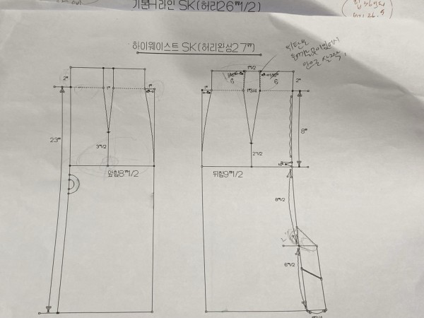 오늘은 강사님이 다트에 관해서 중요성을 말씀해 주셨습니다. 첫 주에 기본 H 라인 스커트 사이즈를 기본으로 응용을 통해 하이웨이스트 스커트 패턴을 그려보고 실제로 광목천을 가지고 실제 재봉을 시도해 봤습니다. 확실히 종이 가봉보다 까다롭고 모양 내기가 어려웠습니다. 처음 재봉틀을 만져봤는데 실이 계속 빠지고 실 방향이 이상한 곳으로 가는 등 여러 시행착오가 있었지만 재봉틀을 만져보고 시도해 봤다는 것의 의의를 두려고 합니다. 앞으로 더 연습해서 손에 익히고 싶습니다.