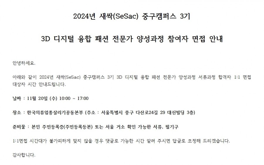 2024년 새싹(SeSac) 중구캠퍼스 3기 3D 디지털 융합 패션 전문가 양성과정 참여자 면접 안내