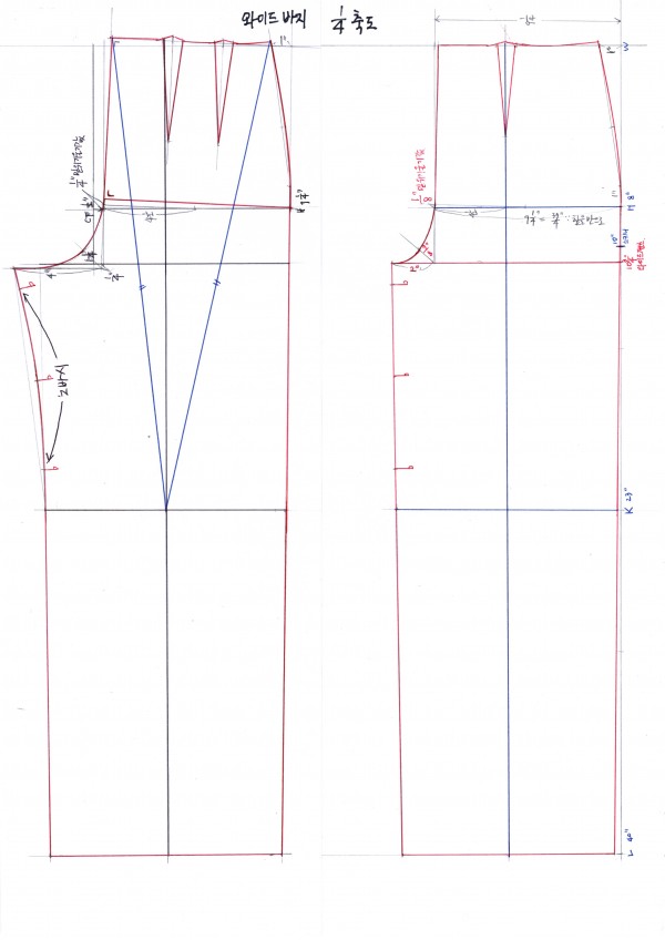 패턴수업 10주차로 지난주 기본정장바지에이어 와이드통바지를 배웠다