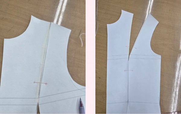 - 앞판에서는 어깨 다트의 중심선을 곡선으로 조정하고, 그 곡선을 반대쪽 다트선으로 옮겨 동일한 곡선 형태를 유지하는 방식을 익혔어요.