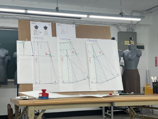 도식화를 보고 패턴을 그릴 때 실루엣을 보는 법부터, 얼마나 늘릴지 기초를 탄탄하게 알려주셨다.