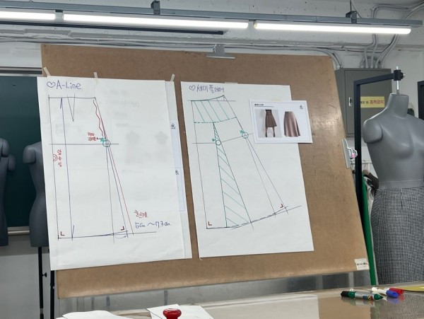 그리고 스커트 기본 원형에서 A라인으로 변형시키는 법, 플레어로 변형시키는 법을 배웠다.