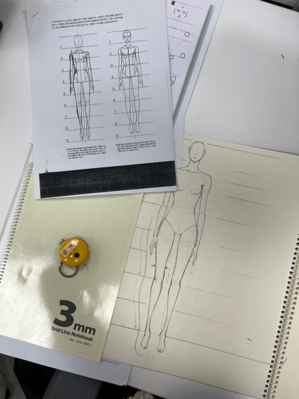 오늘 진도는 여성의 신체를 그려보는 작업이었는데, 생각보다 기본적인 부분에서도 사람의 신체에 대한 감각이 부족하다는 것을 깨달았습니다. 다음 주 수업 전까지 더 많이 그려보고, 자연스럽게 그릴 수 있을 때까지 연습해볼 계획입니다. 그린 신체 위에 타이트한 의류도 입혀보면서 패션 일러스트의 기본기를 다지는 시간을 가졌습니다. 강사님께서는 실제로 옷을 입게 될 평범한 많은 사람들의 다양한 신체 구조를 상세히 파악하고, 어떻게 움직이는지 그 범위나 모양을 아는 것이 모르는 것과는 굉장히 큰 차이임을 강조하셨습니다.