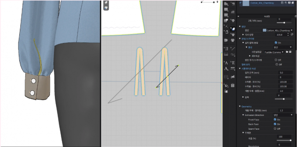 커프스를 배치할 때 여밈 방향에 따라 배치 포인트와 뒤집기 기능을 사용해야 자연스럽게 정렬되었어요.