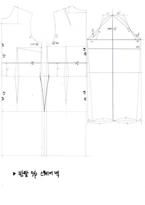 몸판을 제도하고 한장소매에서 기장을 짧게하여 반팔 소매를 제도하였다