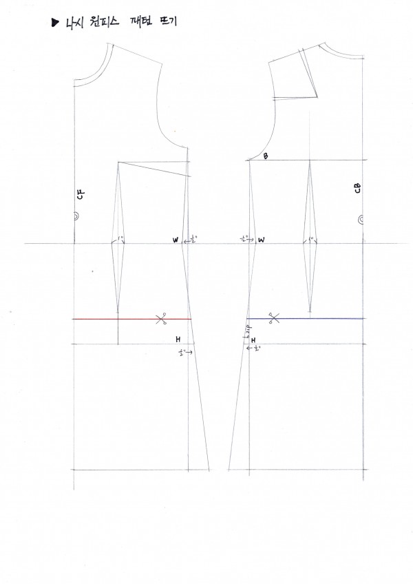 반다트원형을 이용해서 몸판에 다트를 넣고 원피스기장으로 길이를 늘리고,